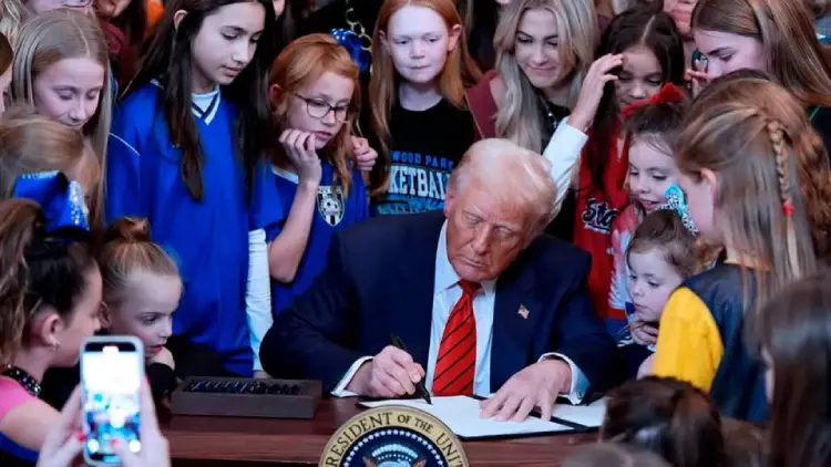 El presidente Donald Trump firmó el miércoles la orden ejecutiva «No hombres en deportes femeninos» en la Casa Blanca, rodeado de una gran multitud de atletas y entrenadoras.